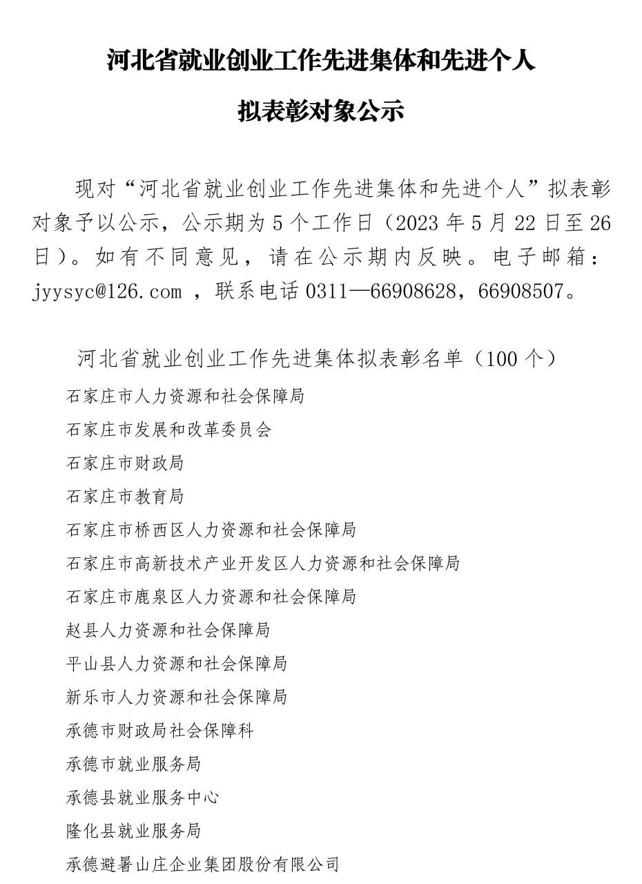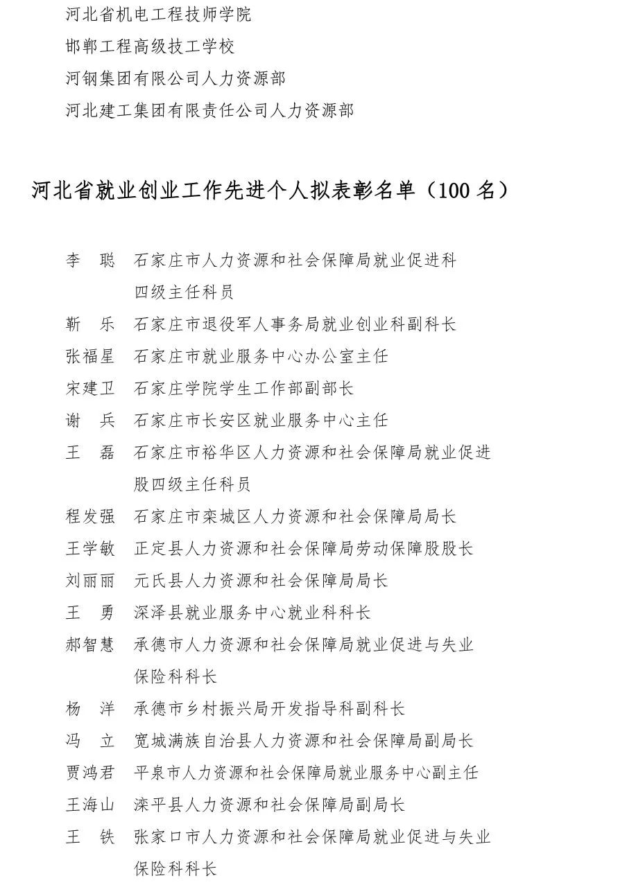5月22日,河北省公示就业创业工作先进集体和先进个人拟表彰对象,具体内容如下: