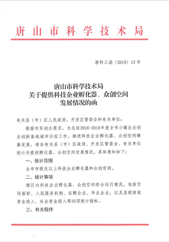点此下载关于提供科技企业孵化器、众创空间发展情况的函附件